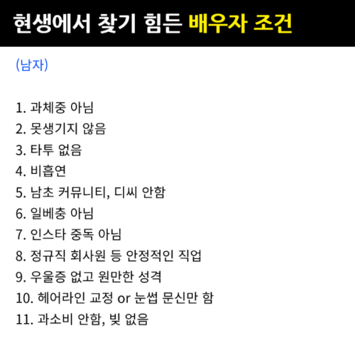 여성,남성 모두 '과체중 아님' '못생기지 않음' '타투 없음'을 요구합니다. 건강하고 매력적인 외모는 첫인상과 일상 에너지에 큰 영향을 주지만, 이 세 가지 조건을 100% 충족하는 사람만 찾기란 쉽지 않죠.