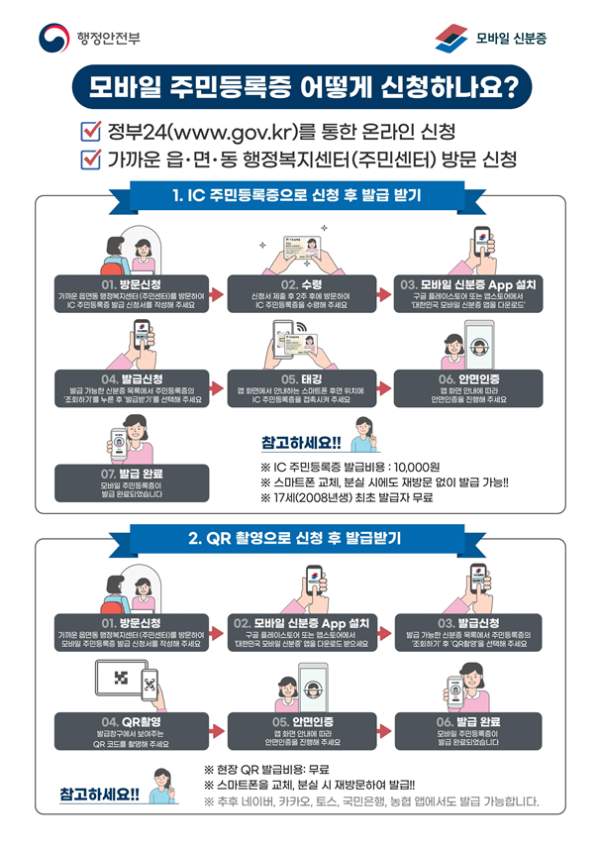 키워드: 모바일 주민등록증, 디지털 신분증, 주민센터, 행정안전부, 정부24, IC 주민등록증, QR 방식
